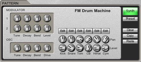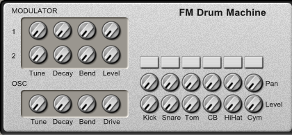 This rhythm synth is FM-Based. Right-half is mixer for each instruments. Left-lower row is the main oscillator and the left-upper two rows are modulators.
