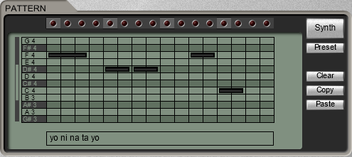 Synth with 1OSC +1LFO +Filter +ADSR. 16 step phrase can be drawn. Drag right for long notes input. Pianoroll range is 2.5 octave. Drag notes name area up or down for scroll.