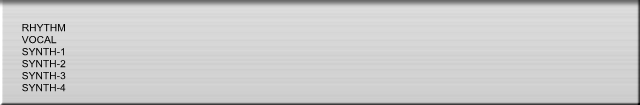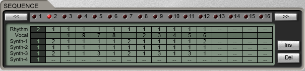 Sequence pattern. The patterns are up to 64 types and upto 256 step sequence. One sequence frame is set of patterns for RHYTHM/VOCAL/TRACK-1 to TRACK-4. Editable by dragging or mouse wheel each frame AFTER FOCUSED. SequencePlay will start from current focused frame and loop to 1st frame when encounterd to the all '--' frame.
