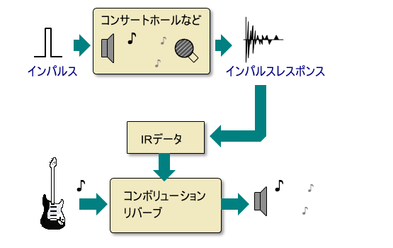 残響を付加するリバーブエフェクトの一種であり、インパルスレスポンス(IR)データと音の信号の間でコンボリューションと呼ばれる処理を行うものを指す。インパルスレスポンスリバーブ(IRリバーブ)およびサンプリングリバーブも同義である