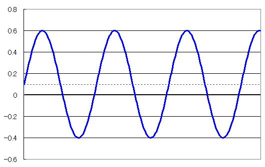 下の図では、信号(青い線)の中心が+0.1程のレベルになっている。このような信号をそのまま使用すると音の接続部でノイズの原因となり、また信号が大きくなると偏っている側で本来よりも早くクリップを起こし歪みが発生する