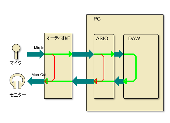 通常の信号の流れは下図の緑の線で示したものである。録音される音はDAWまで流れてから演奏者に返されるが、この場合ある程度の遅れ(レイテンシー)が発生する。これを軽減するため、赤い線で示したようにショートカットする事を「ダイレクトモニタリング」あるいは「ダイレクトモニター」と呼ぶ