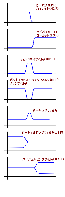 単にフィルターと言っても下の図のように、特性によってLPF / HPF / BPF / ノッチ など多くのタイプがある