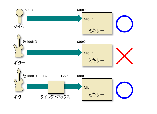 気を付ける必要があるケースとしてエレクトリックギターやエレクトリックベースなどの電気楽器がある。エレクトリックギター、エレクトリックベースのピックアップの出力は数百KΩと、かなりインピーダンスが高く、通常のミキサーのマイク入力などにそのまま接続しても正常に音が出ない