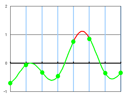 下の図は、デジタルのデータは緑の丸印の部分であり、どれも1.0以内に収まっているが、アナログデータにした場合には赤線の部分で1.0を超えた振幅となっている例である