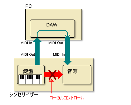 通常単体のシンセサイザーとして使用する場合は当然鍵盤と音源が内部で接続されている必要があるが、PCのDAWなどに接続して鍵盤と音源をそれぞれ使用する場合には、音源部はDAW側からのMIDI信号だけで動作するようにローカルコントロールを「オフ」にする必要がある