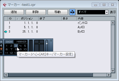 DAWやシーケンサーの機能で、曲中の任意の場所にマークを付けておくためのもの。付けておいたマークを使って素早く目的の場所に移動するために使用する