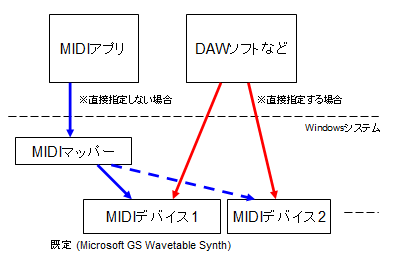 MIDI 再生アプリなどが、どの MIDI デバイスを使用するかを特に指定しない場合、データはこの MIDI マッパーに送られ、MIDI マッパーが既定のデバイスに送るという動作になる