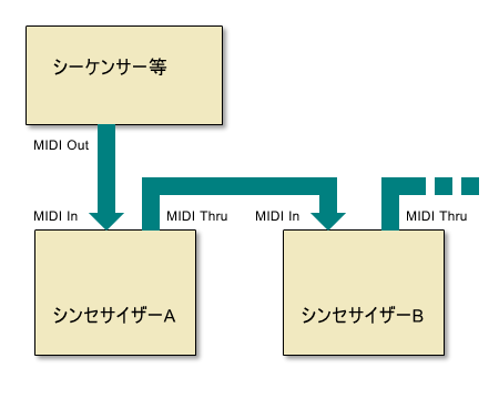 MIDI THRU端子を用いて音源モジュールを数珠繋ぎにする事で、1本のMIDIケーブルの先に複数の音源モジュールを接続する事ができる。接続された複数の音源モジュールはMIDIチャンネルを切り替える事で使い分けるなどの使い方が想定される