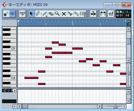 画面の左端縦方向にピアノ鍵盤を配置し、上下方向が音の高さ、右方向に時間軸を取ったシーケンサの音符データ編集画面の事