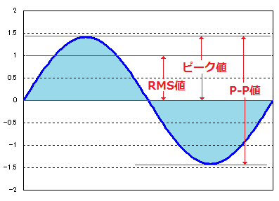 波形がサイン波の場合は、波形のピークレベルに対して RMS 値は(1/sqrt{2} )の大きさとなる。即ち、ピークレベルが(sqrt{2})V=1.414V の時に RMS 値が1.0Vとなる。p-p値 は平均が0とすればピークレベルの2倍であるので、