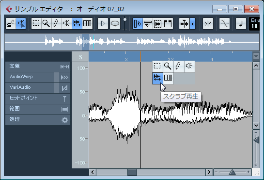 再生速度はドラッグの速度に従いドラッグの方向に従って逆再生も可能な、データの部分的な確認や頭出しなどに便利な機能である。元々オープンリール式のレコーダーではリールを手で回して音の頭の位置を確認する事が可能であったのと同様な操作をソフトウェアで可能にしたものである