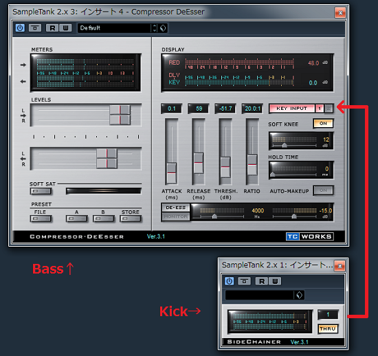 サイドチェインを実現するためには、1つのエフェクターに対して二つの入力ソースが必要となり、VSTの規格上ではVST3.0が必要であるが、独自の工夫でサイドチェイン機能を実現しているVST2.x規格のプラグインもある。良くある形としてはコンプレッサー本体とは別にサイドチェイン入力用の小さなプラグインが準備されており、両者の間で独自に信号の受け渡しを行うような構造である