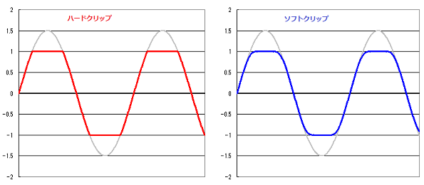 信号波形が飽和して発生するクリップの中でも緩やかに曲線を描いて一定レベルで切り取られるクリップの事を指す。ソフトクリップに対して急激にクリップされる事を「ハードクリップ」と呼ぶ