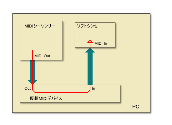 通常は MIDI 出力と MIDI 入力を持ち、MIDI 出力に出したデータがそのまま MIDI 入力に戻ってくるようなループバック動作をする